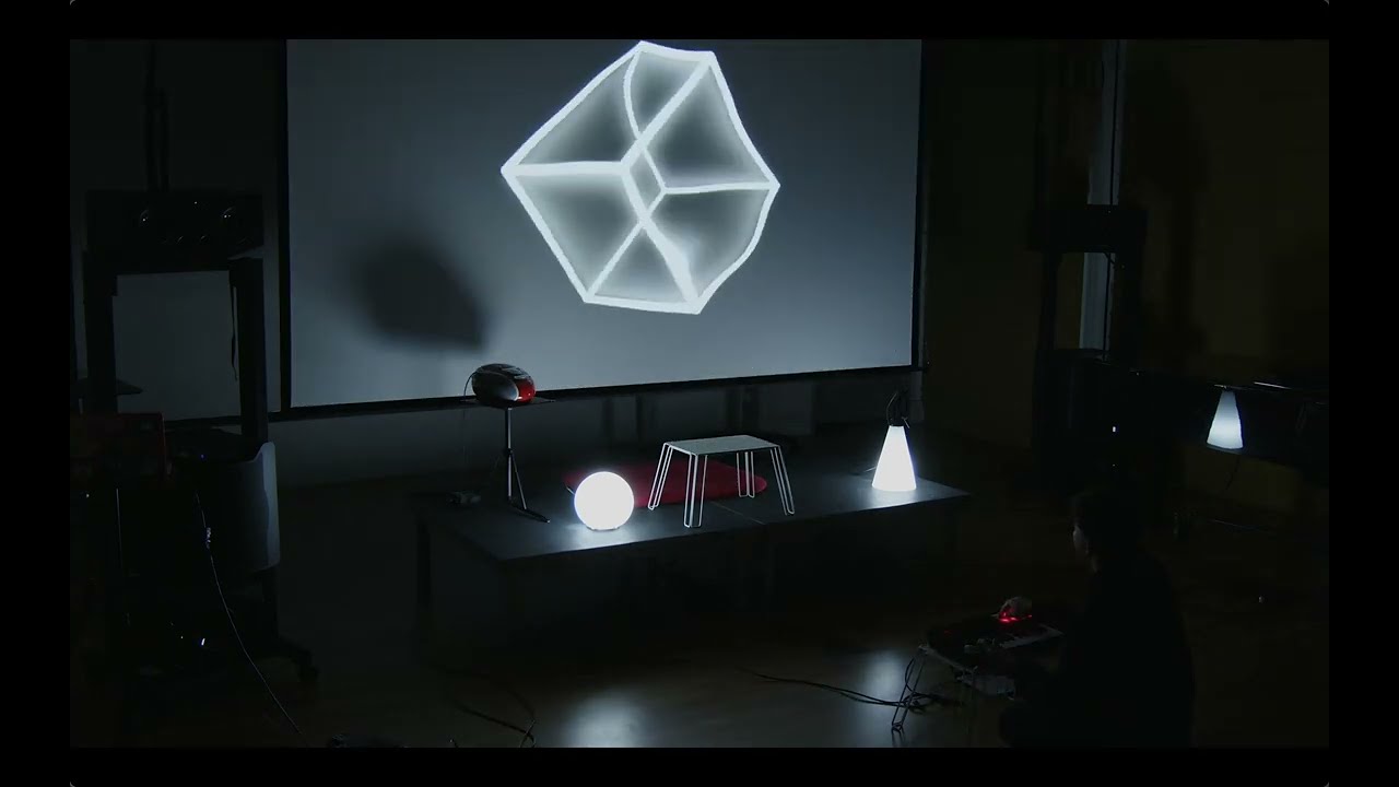 For my audiovisual performance, I wanted to reveal the process of creating. As an artist, the hours and hours of ideation, experimentation, restarting, and inspirations are never perceived by any audience. All that the audience sees is the final result, the performance in which everything culminates into. To convey this idea, I split my performance into two parts: the first part being the completion of my audiovisual system, in which I am in my room putting the finishing touches on it, and the second part being the actual audiovisual performance. For the first part, I am on a stage designed to mimic my room, facing the audience, and the second part, I step down, facing the screen to perform. My system was relatively simple, consisting of a TouchDesigner patch to control lighting and visuals and an Ableton project for audio. I had a MIDI keyboard to control both.