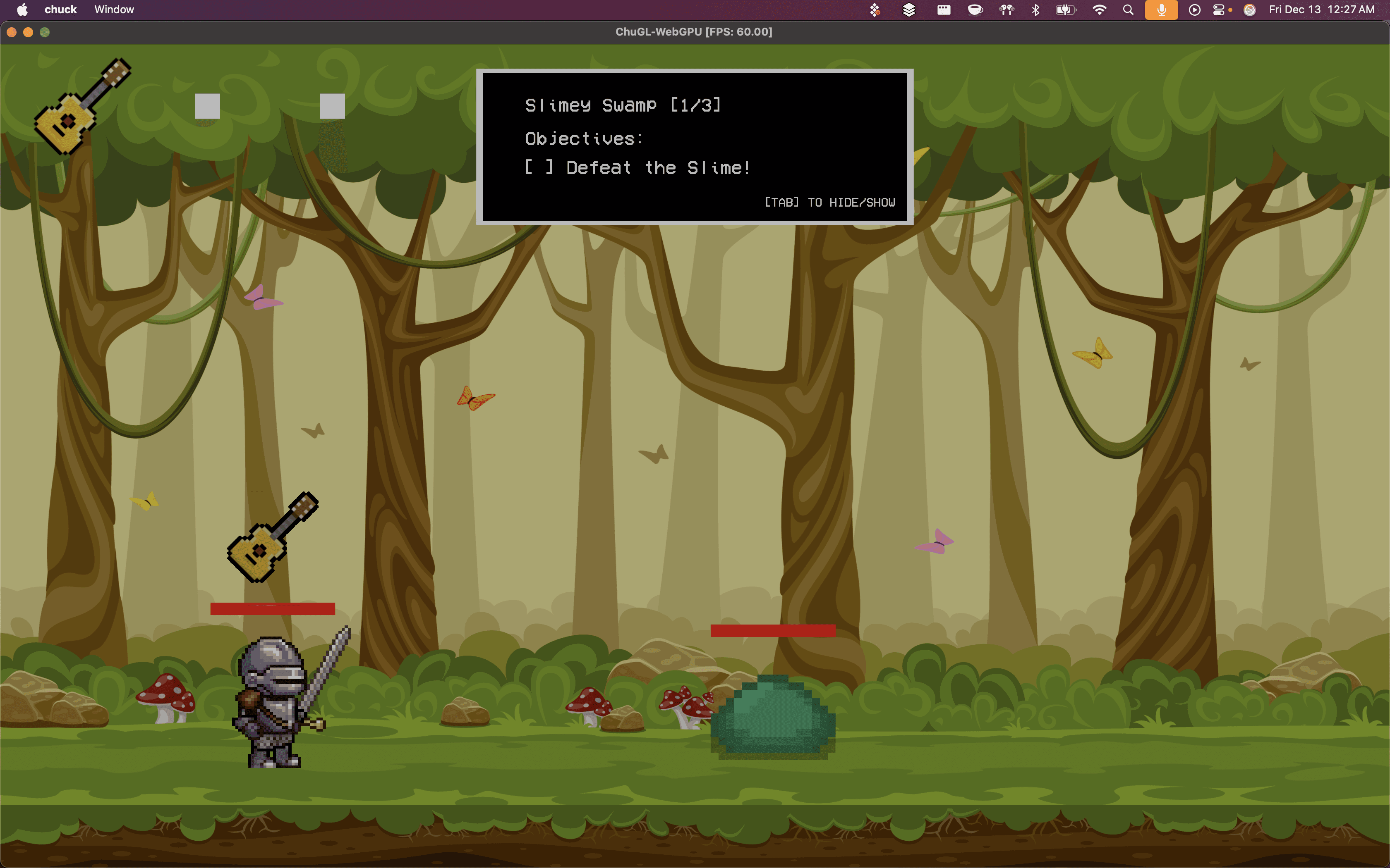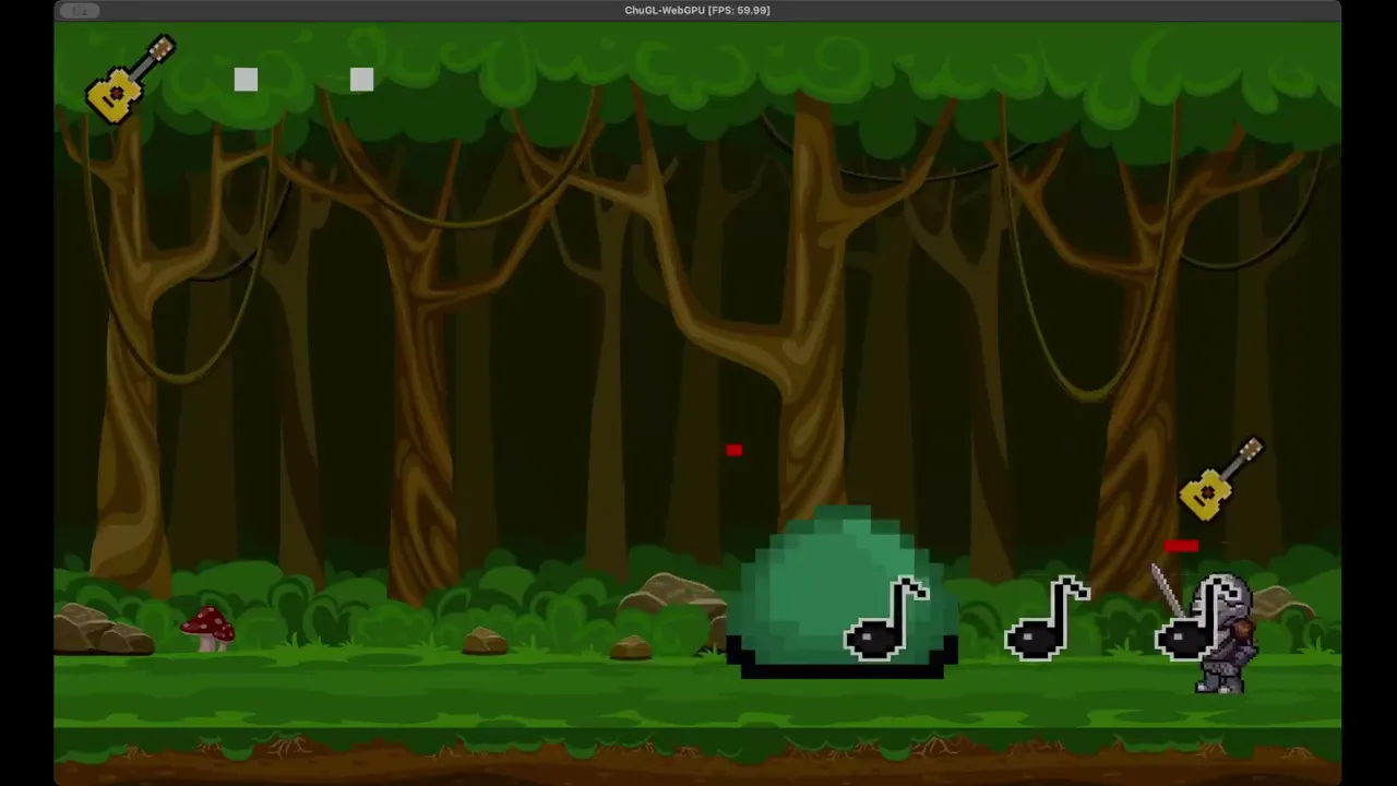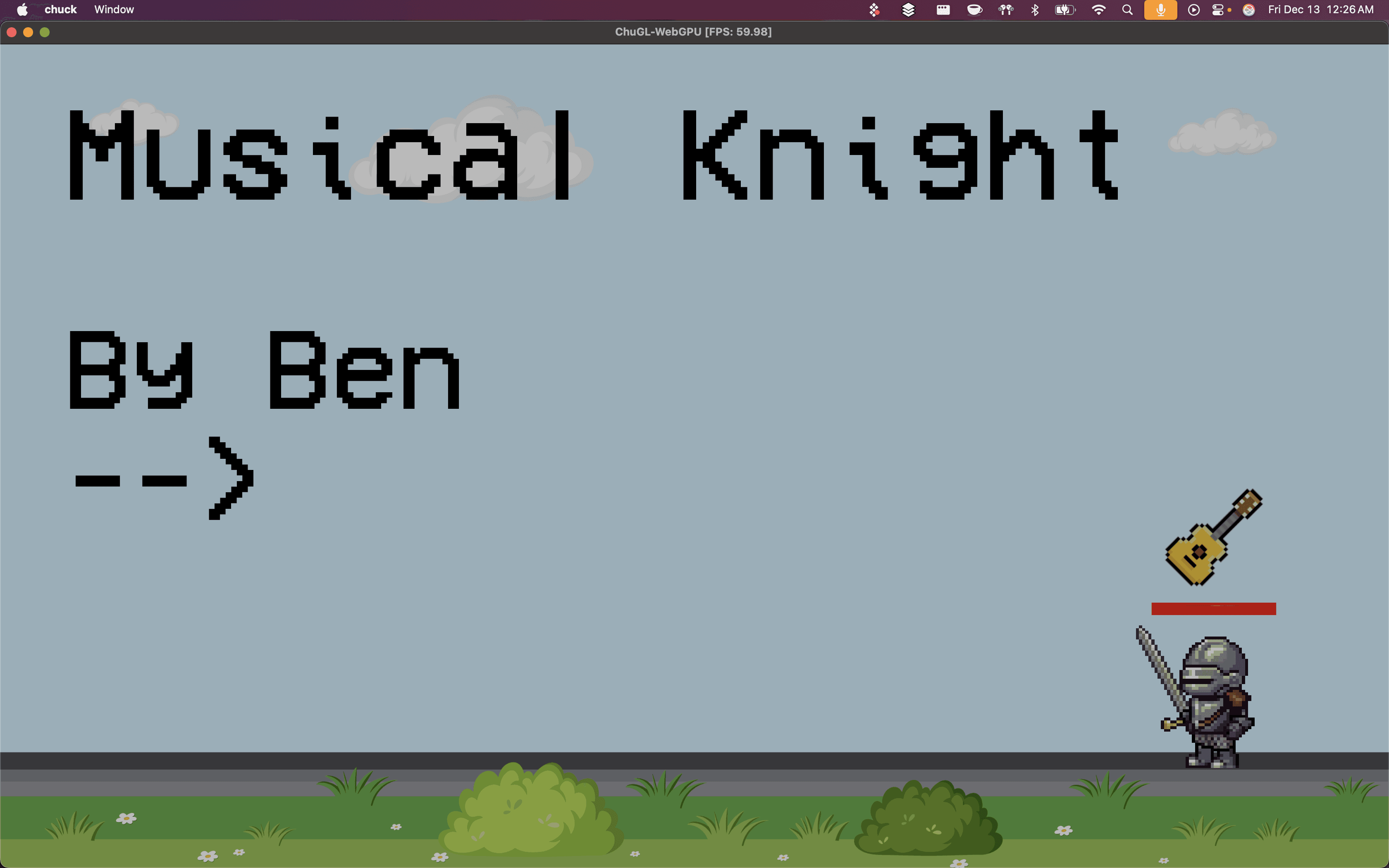 Musical Knight is an audiovisual 2D pixel art game following a hero who uses instruments as weapons to defeat the Evil Dragon. Written in ChucK and ChuGL.