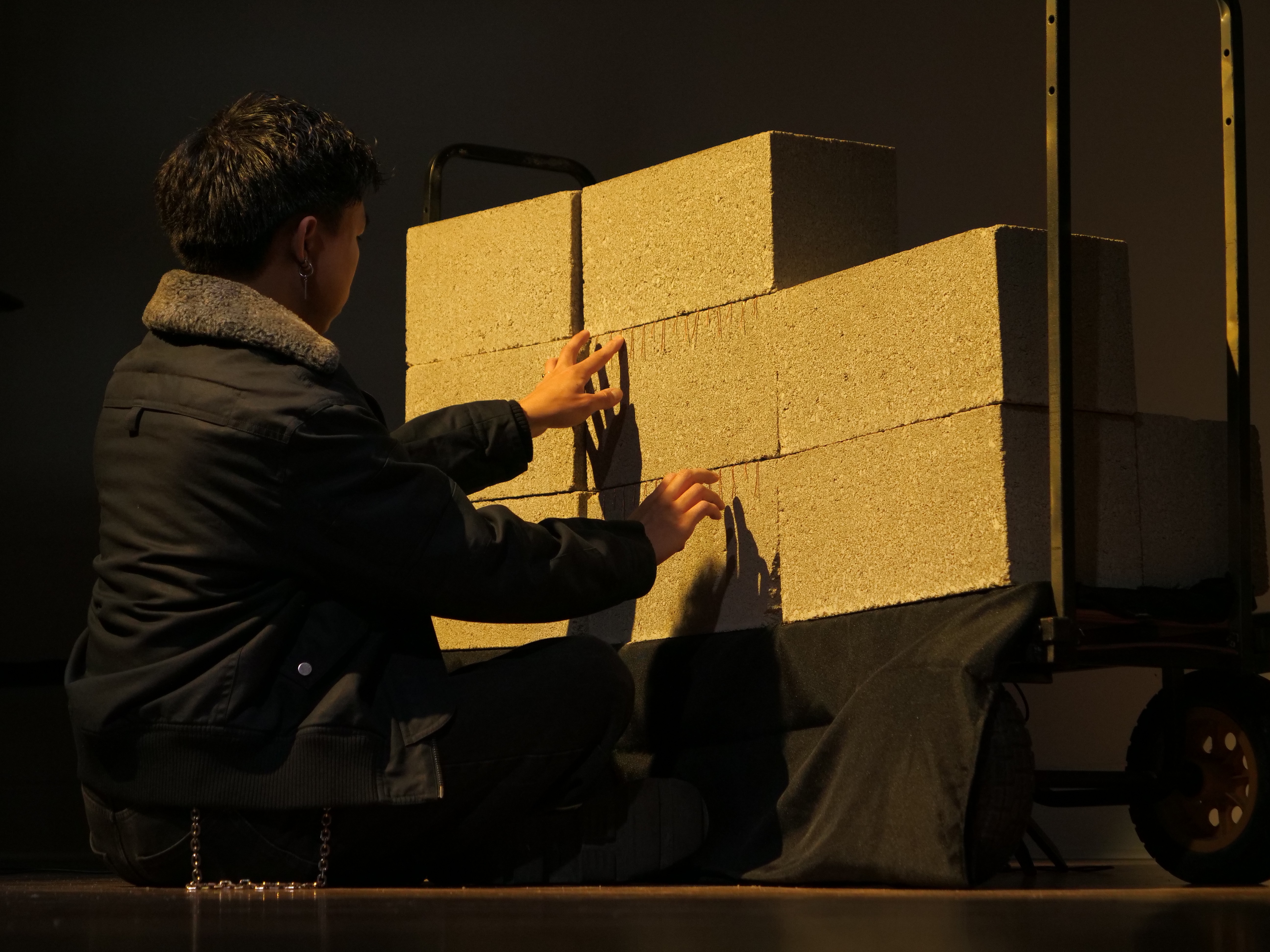 A performance inspired by the story of a pianist who trained his muscle memory on the walls of his prison cell. Performed with a brick wall retrofitted with 30 capacitive-sensing wires, which sends MIDI to the Disklavier via a Trill board and a Teensy.