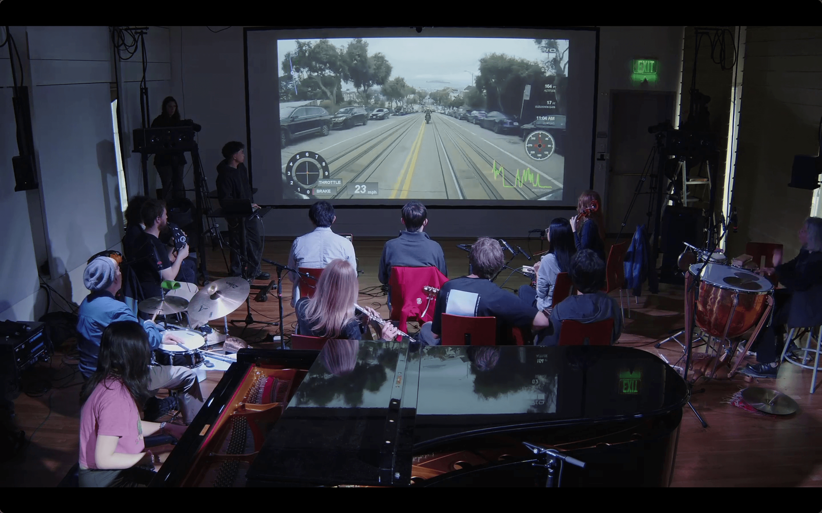 “A Nice Chill Ride” is a sonification of motorcycle video and telemetric data taken from a chin-mounted GoPro on nice chill rides around the Bay Area. With my motorcycle POV video as the score, performers track various telemetric data such as speed, g-forces, and acceleration, and various data from the surroundings to sonify my motorcycle ride!